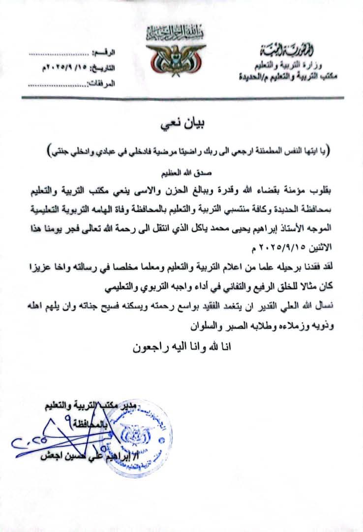 مكتب تربية الحديدة ينعي وفاة المعلم ابراهيم ياكل