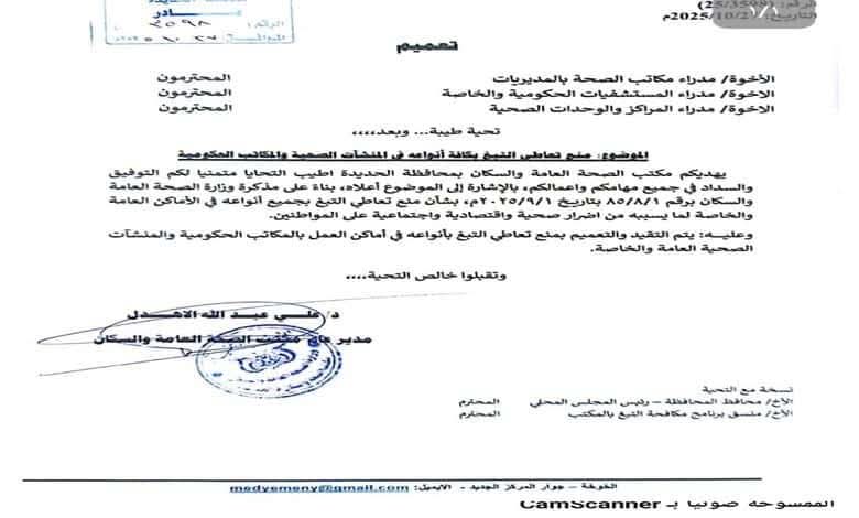 مكتب الصحة بالحديدة يصدر تعميم رسمي بمنع تعاطي التبغ في المنشآت الصحية