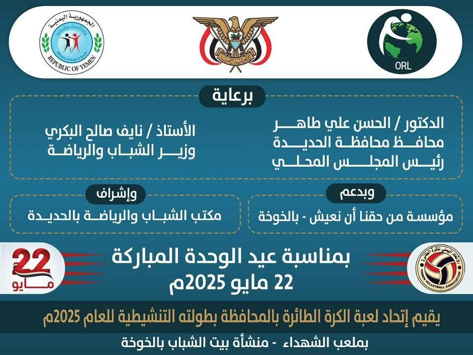 مكتب الشباب والرياضة بالحديدة يدعو الجمهور الرياضي لحضور إفتتاح بطولة 22 مايو لكرة الطائرة في الخوخة